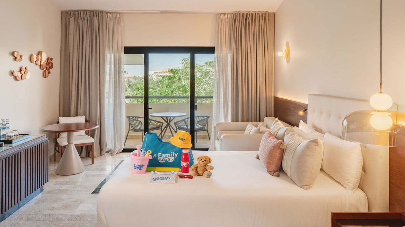 Family Selection Junior Suite - Grand Palladium Kantenah Resort & Spa - Unwind in this spacious junior suite featuring stunning views of the lush mangrove forest and a furnished balcony, perfect for enjoying the Caribbean breeze. fter an exciting day filled with activities and family fun, relax in the hydromassage bath with shower or in the comfortable living room with a sofa bed. Designed for both comfort and flexibility, the suite offers either one king bed or two double beds plus a sofa bed to suit your family’s needs.