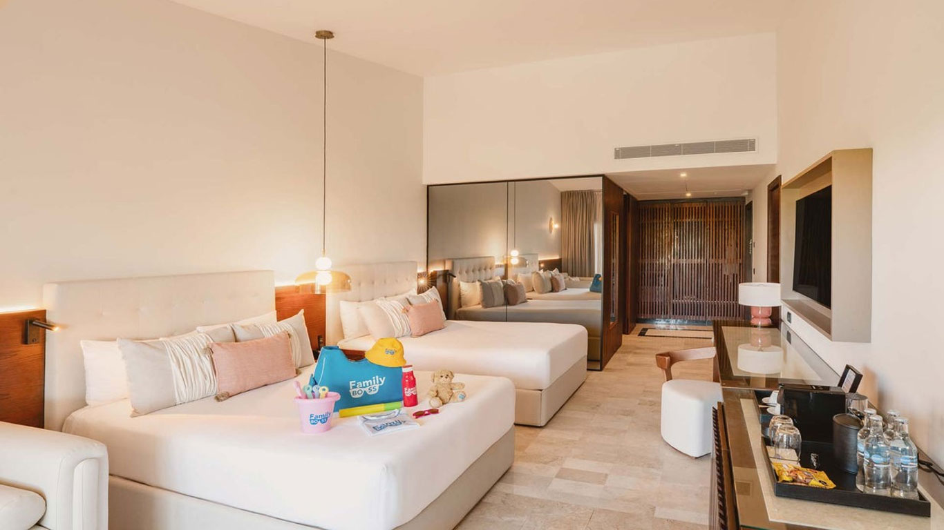 Family Selection Junior Suite Swim Up – Grand Palladium Kantenah Resort & Spa are spacious, light-filled suites are designed across two levels, featuring a private pool and a furnished terrace on the upper floor.